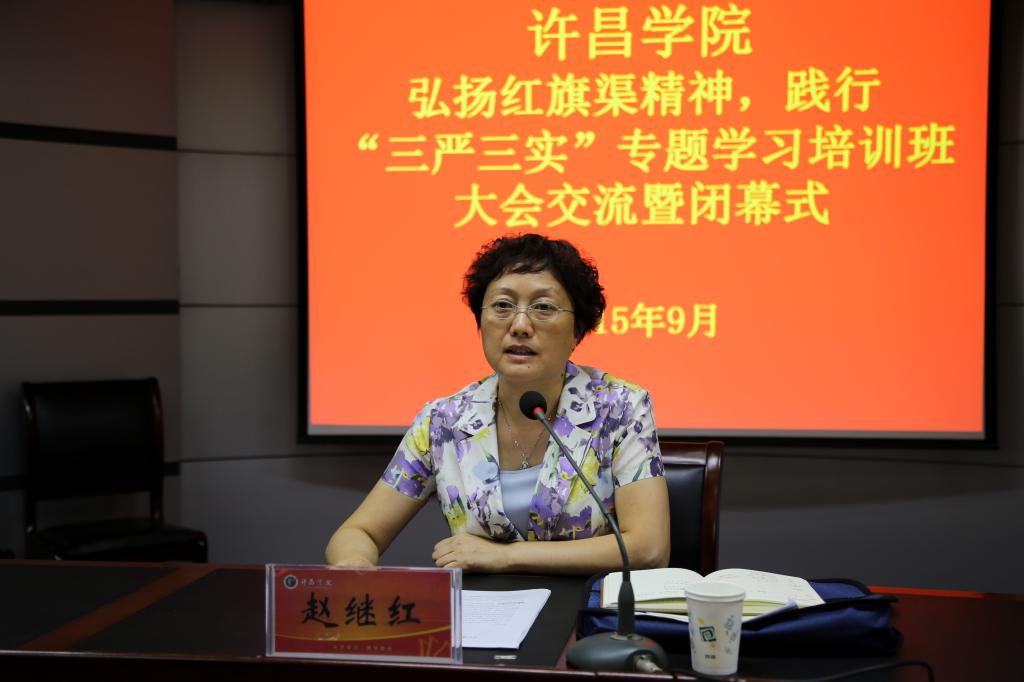 ,我校举行弘扬红旗渠精神,践行“三严三实”专题学习培训班大会交流暨闭幕式。校党委副书记、院长赵继红出席会议并讲话。党委副书记马超,副院长张建军、赵正风、郑直、崔斌、黄怡俐、郭涛,纪委书记罗凤英,工会主席杜志傲出席会议,参训的中层领导干部参加会议。会议由党委副书记马超主持。
