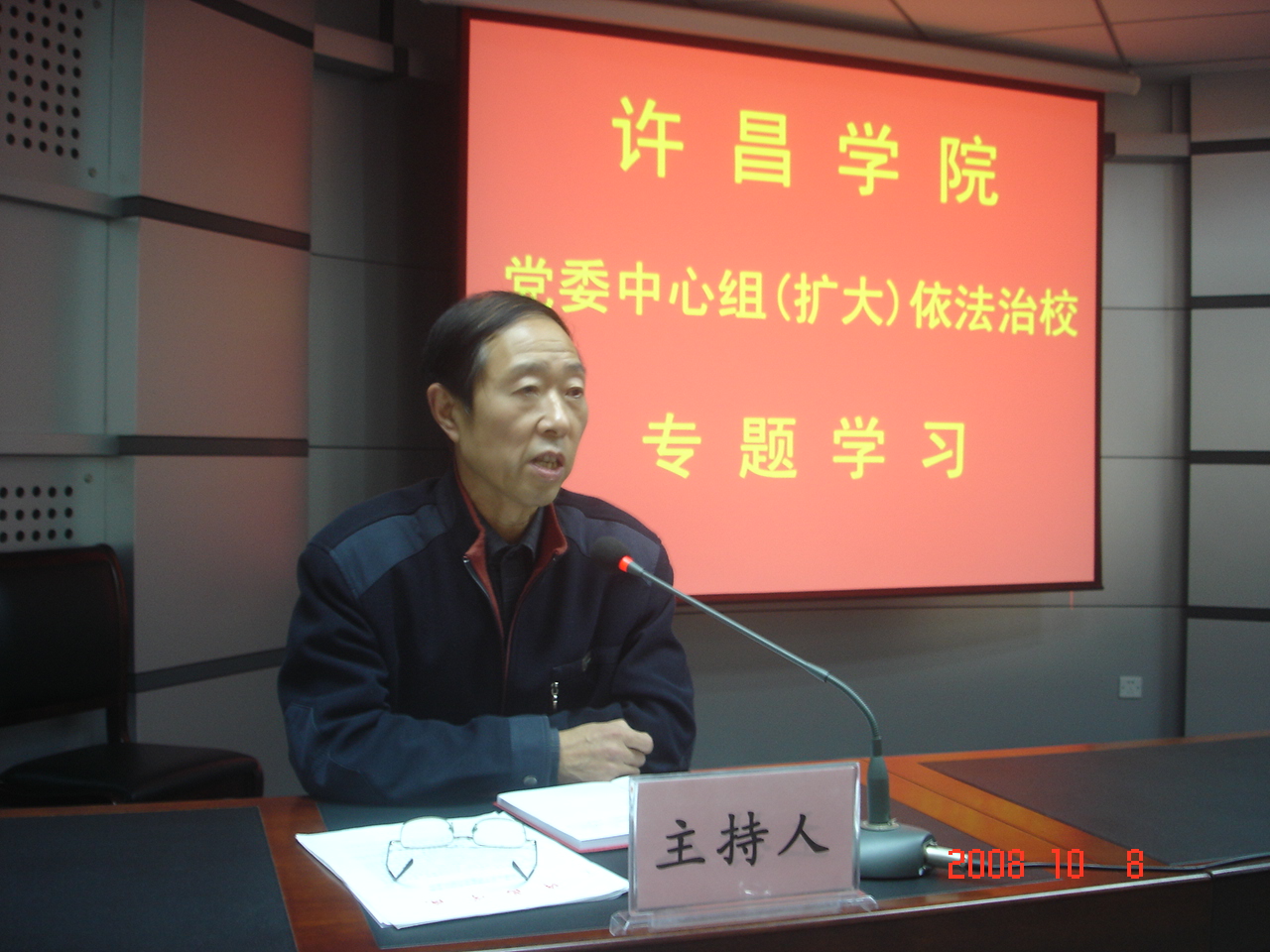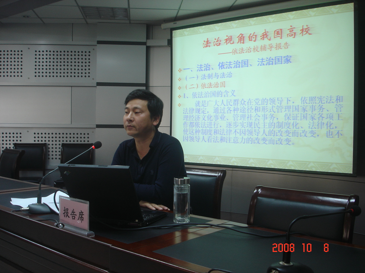 下午,学校领导班子成员仉建涛、陈建国、汪庆华、黄桂贞、晁召行、张建军、马超与全体中层领导干部一起在第三会议室集中听取学习了依法治校专题辅导报告。辅导报告由校报编辑部主任、我校法律顾问朱国君主讲,党委副书记汪庆华主持了报告会。