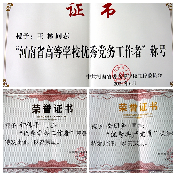 支部全体党员始终加强政治理论学习,认真履行职责,在自觉承担“举旗帜、聚民心、育新人、兴文化、展形象”的使命任务中,不断增强“四个意识”,坚定“四个自信”,做到“两个维护”,涌现出一个个先进典型。支部王林同志被评为“河南省高等学校优秀党务工作者”,钟伟平同志被评为“许昌学院优秀党务工作者”,岳凯声同志被评为“许昌学院优秀共产党员”。