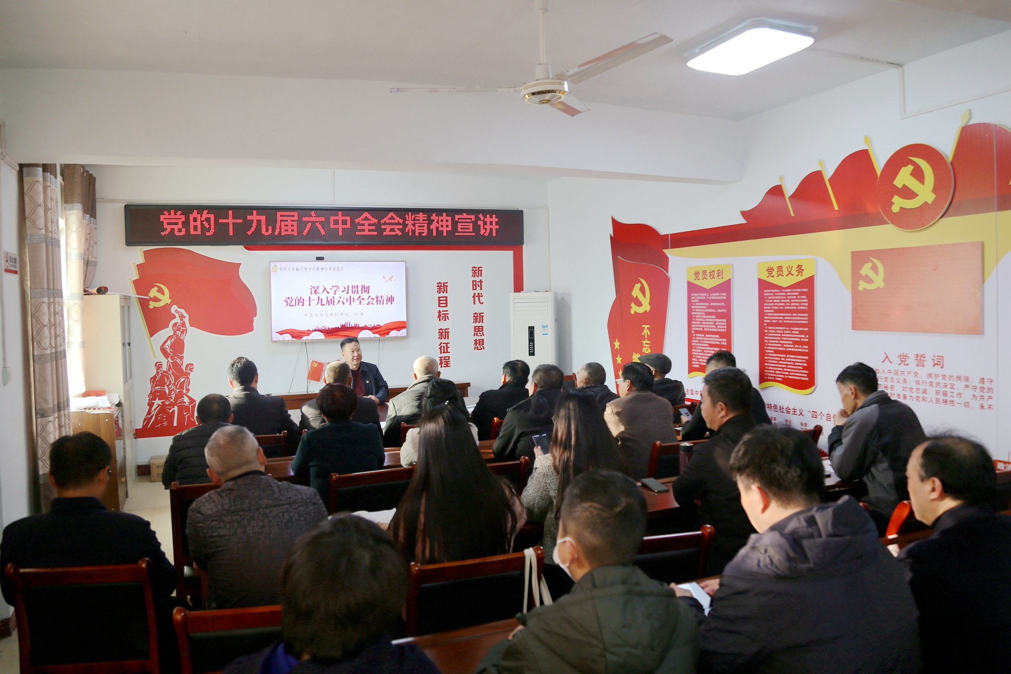 在袁庄村党群服务中心,孙海副书记以《深入学习贯彻党的十九届六中全会精神》为题为大家作宣讲。袁庄村“两委”班子成员代表、老党员同志代表、党员教师代表,许昌学院党委宣传部党支部党员等现场聆听。孙海副书记用丰富的理论、生动的语言,围绕马克思主义中国化的“三次飞跃”、“两个确立”的决定性意义、“十个坚持”百年奋斗历史经验等方面,对大会审议通过的《中共中央关于党的百年奋斗重大成就和历史经验的决议》进行了重点解读,让全会精神深入基层、入脑入心。