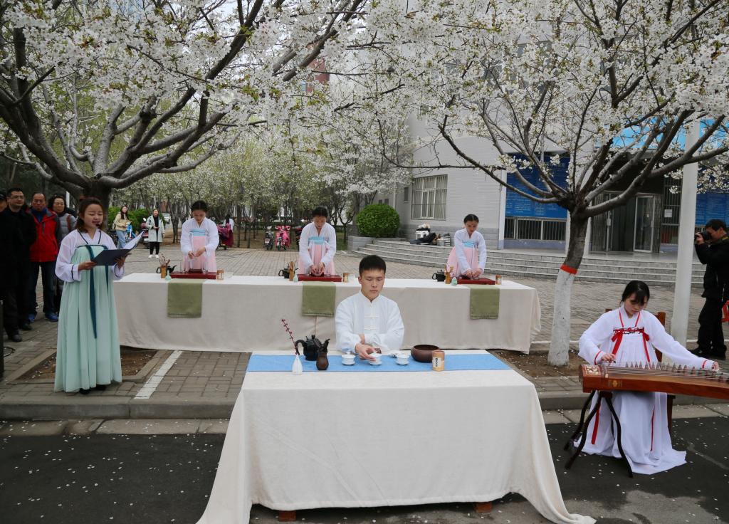 茶引花香,花依茶味。我国的茶文化历史悠久,底蕴深厚,花茶作为茶类的一种亦是如此。旅游(历史文化)学院在樱花文化节期间推出了樱花茶,供游客品尝。典雅的服装、娴熟的动作,吸引了大批游客前来品茶,让更多的人了解到了茶文化的魅力。这正是:汉衣襦裙翩翩舞,樱花缤纷惹茶香。