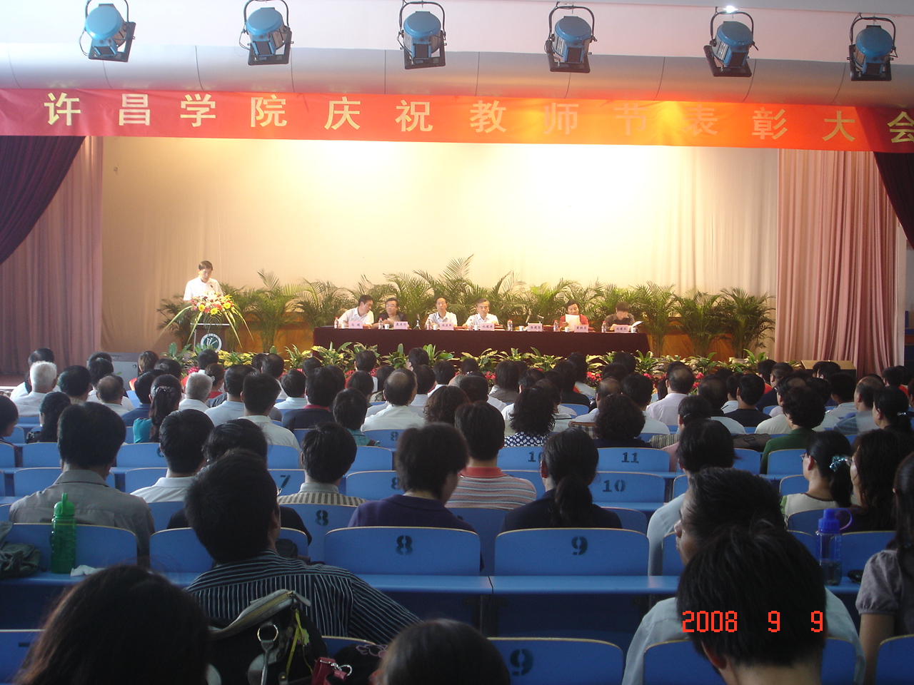 院党委副书记汪庆华在大会上宣布了关于表彰“2007-2008学年度获厅级以上奖励的单位和个人”的通报、副院长晁召行宣布了关于表彰“许昌学院首届教学名师”的决定和关于表彰“2007-2008学年度教学科研工作情况”的通报;校党委副书记黄桂贞、副院长冯建业、工会主席马超分别宣布了关于表彰“第二届十佳青年教师标兵”、“2007-2008学年度优秀青年教师”、“从教三十年以上教师”、“向抗震救灾英雄教师学习演讲及诗文朗诵会”获奖单位等决定。获奖单位代表和个人身披绶带,胸戴红花,在欢乐喜庆的乐曲声中一一上台领奖。