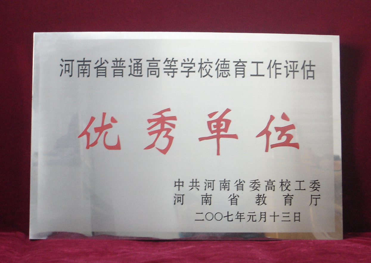 3月27日,省委高校工委、省教育厅在省人民会堂三楼会议厅召开“2007年度全省高校宣传思想工作会议”,省委高校工委副书记、省教育厅副厅长訾新建向2006年度全省高校德育工作评估优秀单位颁发奖牌并作重要讲话,社政处长陈垠亭主持会议并就有关工作进行了安排,教育厅有关处室负责人出席会议,我校党委副书记汪庆华、党委宣传部长汪永智、党委学工部长肖绍俊参加了会议,汪副书记代表我校上台领取了“河南省普通高等学校德育工作评估优秀单位”的奖牌。