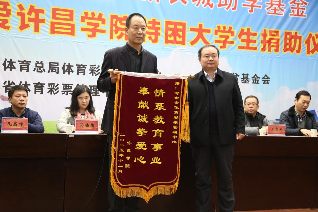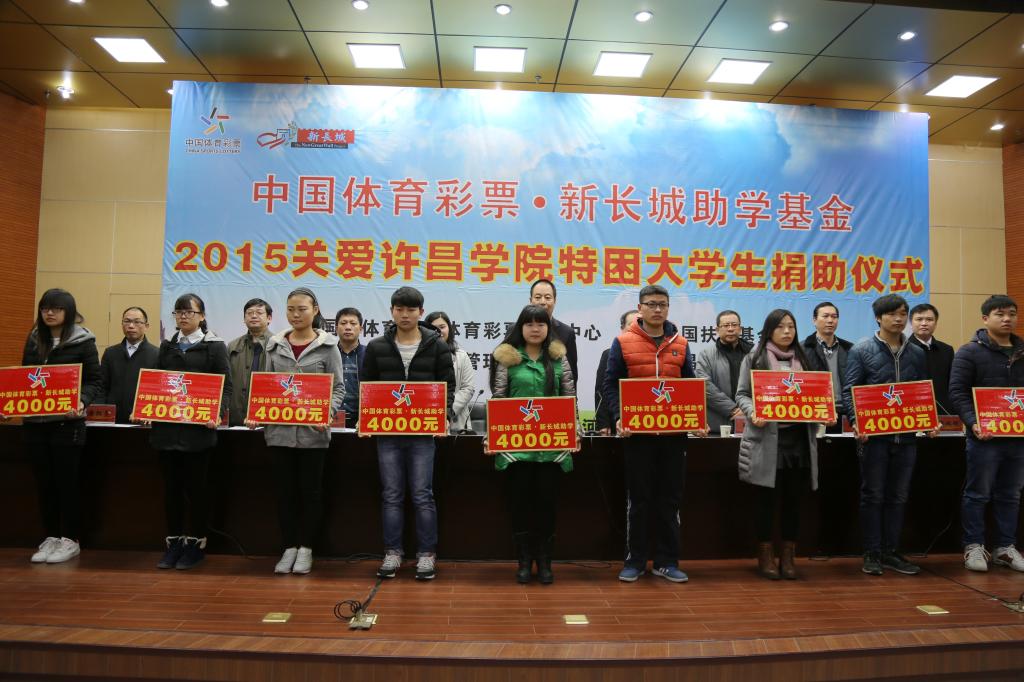 12月17日上午,2015“中国体育彩票·新长城助学基金”关爱许昌学院优秀困难大学生捐助仪式在我校学术报告厅举行。河南省体育彩票管理中心主任孙和平,中国扶贫基金会品牌传播主管马楠楠、人民日报体育部综合室主任王霞光、许昌市体育局副局长赵西川、省体彩中心许昌分中心主任胡波,我校副院长郭涛等领导出席了本次捐助仪式。参加仪式的还有各学院党总支书记、副书记、辅导员、受资助学生、体彩网点业主、销售员代表。人民日报、国家彩票杂志、新浪网、河南日报、河南电视台都市频道、河南电视台民生频道、大河报、河南商报等10余家省级以上新闻媒体对捐助仪式进行了采访报道。捐助仪式由学生处处长张鹏辉主持。