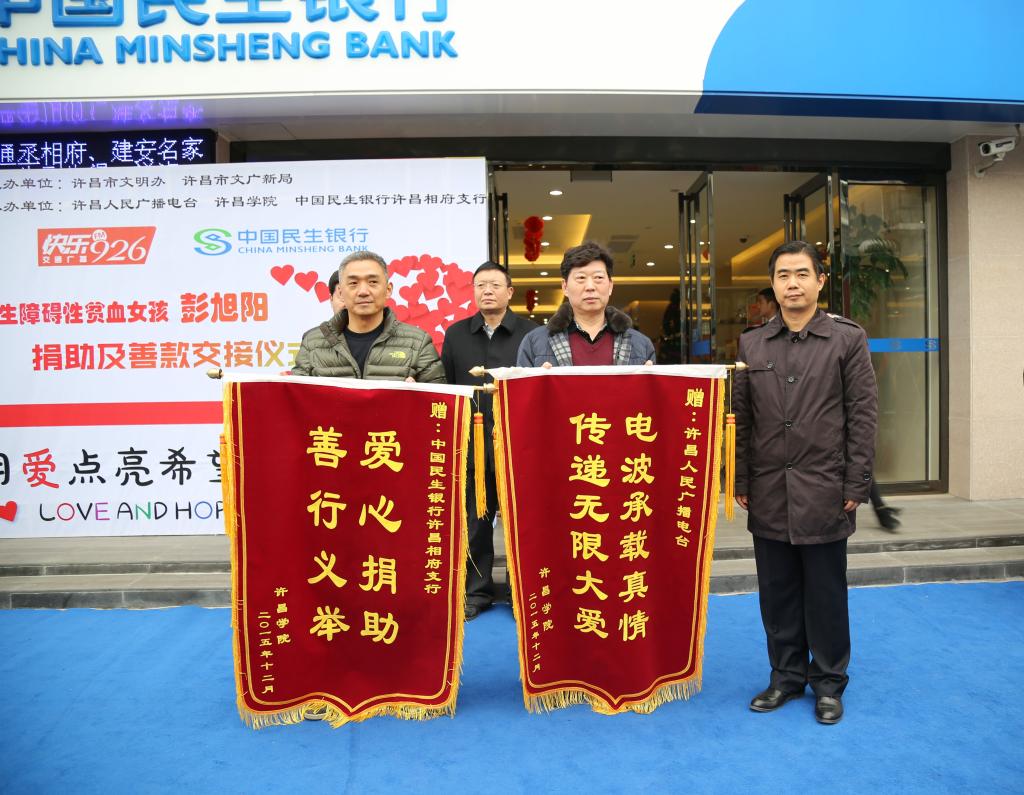 张华代表旭阳父母对全校师生及社会各界朋友的慷慨解囊和无私帮助表示诚挚的感激。许昌市文广新局副局长马会亭将饱含浓浓爱意的善款交到旭阳同学家人手中。校党委宣传部部长冯晓民代表学校向许昌人民广播电台、民生银行赠送锦旗。