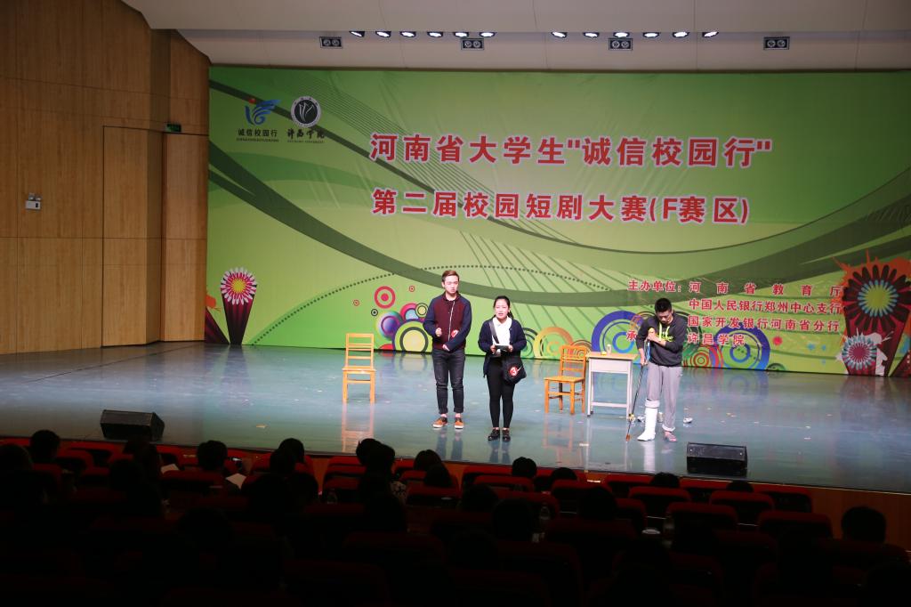 4月8日,河南省大学生第二届“诚信校园行”校园短剧大赛F赛区复赛在我校音乐厅举行。河南省教育厅学生资助管理中心高校管理科主任戴晓明、工会委员孙惠萍等一行8人带队到现场指导观摩,我校副院长郭涛出席活动现场。来自14所学校的116名学生参加了比赛。