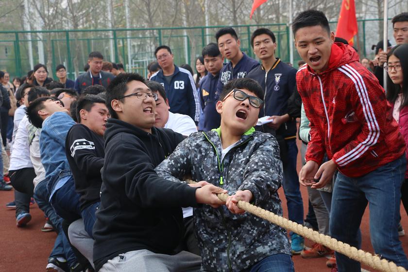 拔河比赛是我校一项传统赛事,已连续举办了七届。通过此类比赛活动进一步活跃校园气氛、弘扬阳光体育精神、展现青年学子的精神风采,也有助于提升大学生的身体素质和顽强拼搏的意志,增强学生的组织纪律性和集体主义精神。(摄影:薛冰)