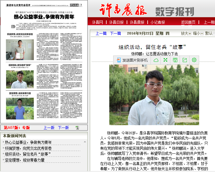 【编者按】2016年9月22日《许昌晨报》第七版《热心公益事业 争做有为青年》一文中,以《组织活动,留住老兵“故事”》为题对我校国际教育学院编外雷锋连张帅鹏志愿者的事迹进行报道,全文转载如下: