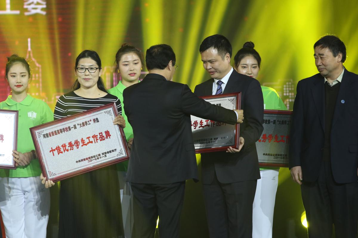 11月28日,由省高校工委、省教育厅主办的河南省普通高等学校第一届“大美学工”颁奖典礼在河南大学举办,河南省委高校工委书记、省教育厅厅长朱清孟,省教育厅副巡视员李金川,河南省教育厅学生处长王继东等出席典礼,并为获奖单位、个人和品牌颁奖。
