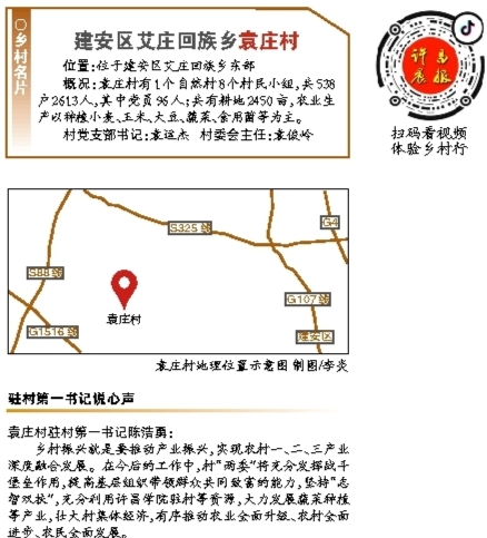 “结合乡村振兴战略及建安区整体发展布局,下一步,我们将依托新元大道西延工程,对袁庄村进行整体乡村振兴发展规划。”陈浩勇说,该村将打造生态农业项目,通过整合村内闲置宅基地,打造具有乡村特色的乡愁文化小院、产业扶贫小院等,吸引城市高收入阶层感受乡村文化;结合休闲生态农业发展租赁、采摘、住宿等项目,实现一、二、三产业融合发展;带动有劳动力的贫困户和一般农户在本村就业,对无劳动能力的贫困户实现产业带贫。