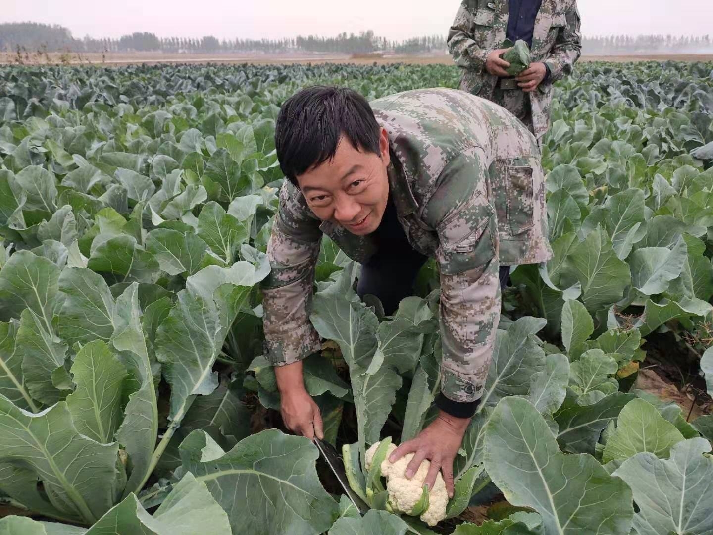 袁亚州正在地里采摘花菜。 许昌报业全媒体记者 肖涛 摄