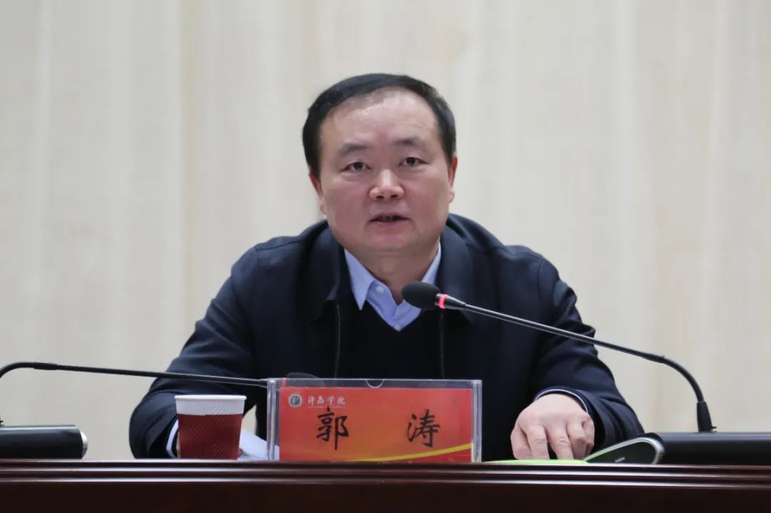 结合全国和全省教育工作会议精神,就如何更好地抓好今年工作落实,郭涛强调,一要准确识变应变求变,在把握高等教育发展大势中增强学校高质量发展的坚定信心。要进一步放大坐标,将学校发展放到全国、全省高等教育发展的大势中去审视,放到区域经济发展的大局中去谋划,放到教育强省的战略中去推进,紧紧抓住历史机遇期,牢牢把握高质量发展的时代主题,强化机遇意识、竞争意识和质量意识,不断开辟发展新领域新赛道,塑造发展新动能新优势。二要聚焦改革攻坚重点任务,奋力推进学校事业高质量发展。要团结凝聚全校师生合力,发扬斗争精神,迎难而上、攻坚克难,以锲而不舍的钉钉子精神持续抓好申硕、更名、新校区征地建设工作和“三大改革”任务的推进落实,切实推动学校向更高质量、更高水平、更高层次发展。三要全面加强党的领导和党的建设,为学校高质量发展提供强有力保障。要把学习宣传贯彻党的二十大精神作为首要政治任务抓紧抓实,扎实做好巡视和审计整改工作,重点做好安全稳定工作,狠抓工作落实,确保各项任务有效落实落地。郭涛要求,全校上下要切实把思想和行动统一到校党委、校行政的决策部署上来,以更高的政治站位、更强烈的责任担当、更饱满的精神状态,凝心聚力,鼓足干劲,在攻坚克难中开辟许昌学院建设发展的新天地,共同创造许昌学院更加美好的明天。