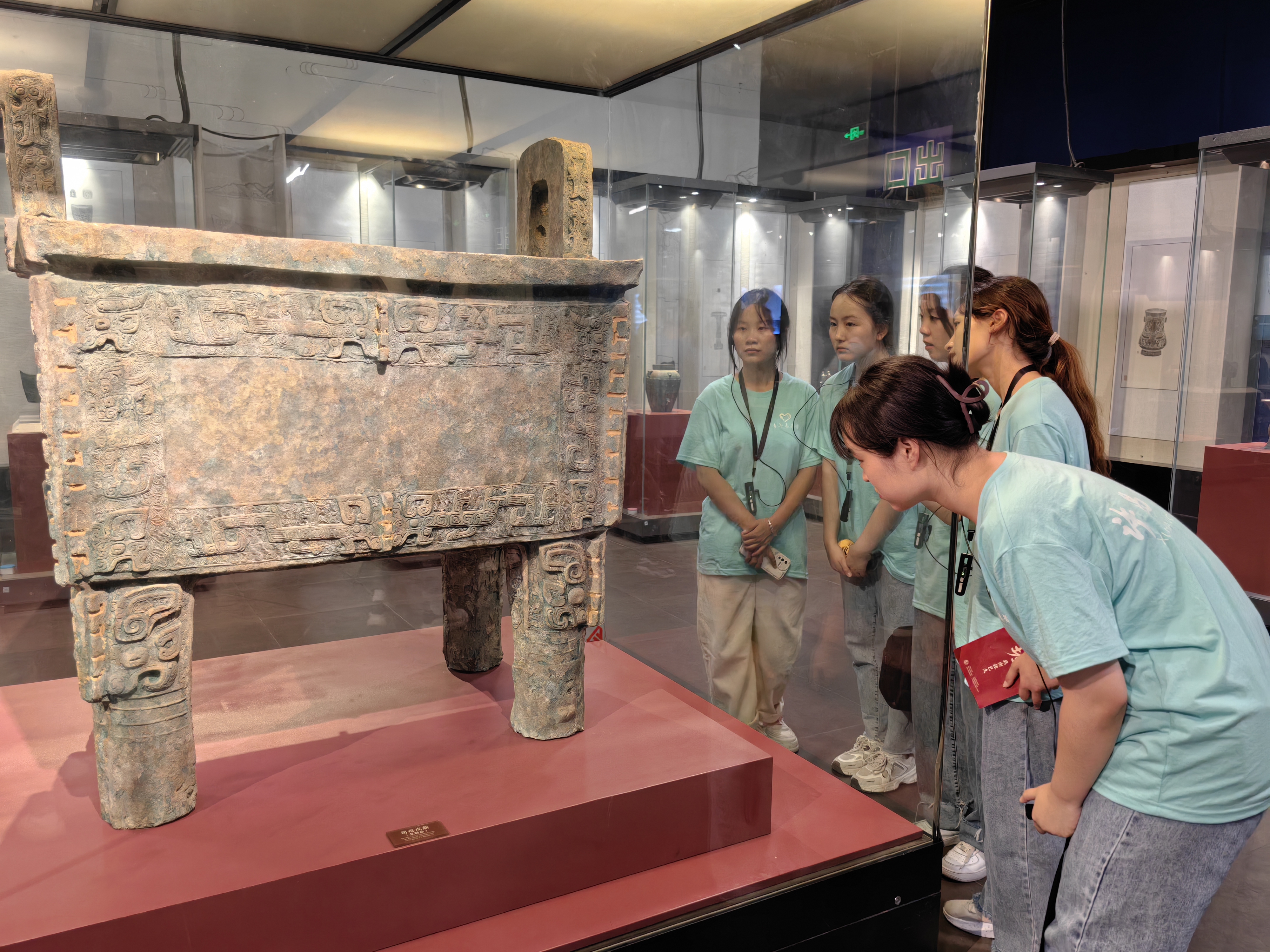 在殷墟博物馆,队员们见到了原本只出现在课本上的商代刻辞卜骨、纹饰精美的国家宝藏亚长牛尊、重两百多斤的“司母辛”铜鼎……隔着玻璃触摸它们,仿佛与先辈进行了一场跨越时空的对话。
